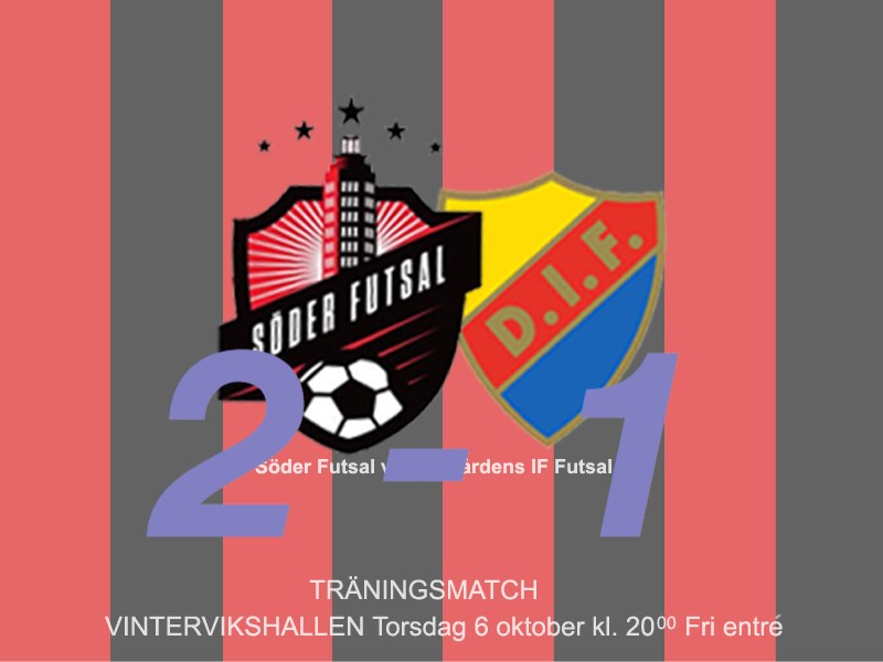 Det blev seger för Söder Futsal i säsongens första träningsmatch då Djurgårdens IF FF besegrades med 2 - 1. Med, på dagen, en månad kvar till säsongspremiären i Svenska Futsalligan var matchen en viktig värdemätare. Söder Futsal provade fem nya spelare. En av dem som spelade sin första match för Söder Futsal var Besim Kunic. Besim fick också göra sitt första mål då han efter ett bra förarbete från kapten Aleks Tomewski kunde ta sig runt ett samlat försvar och plasera in bollen i kassen. Niels Brolev dundrade in Söders andra mål. Tränarduon är väldigt nöjda med hur de etablerade spelarna hjälper de nya att hitta rätt i spel och positioner. Trots att det finns mycket att rätta till värmer det ändå att se den här truppens potential. Att Djurgården förlorar matchen är nog mest av akademiskt intresse då det kommer stå i historieböckerna. Laget är riktigt bra och man har stora chanser att vinna sin division ett serie. Matchens lirare: Miguel, MV Söder Futsal Obs: Under de närmaste dagarna presenterar vi nyförvärven på soderfutsal.se så håll koll på sidan :)